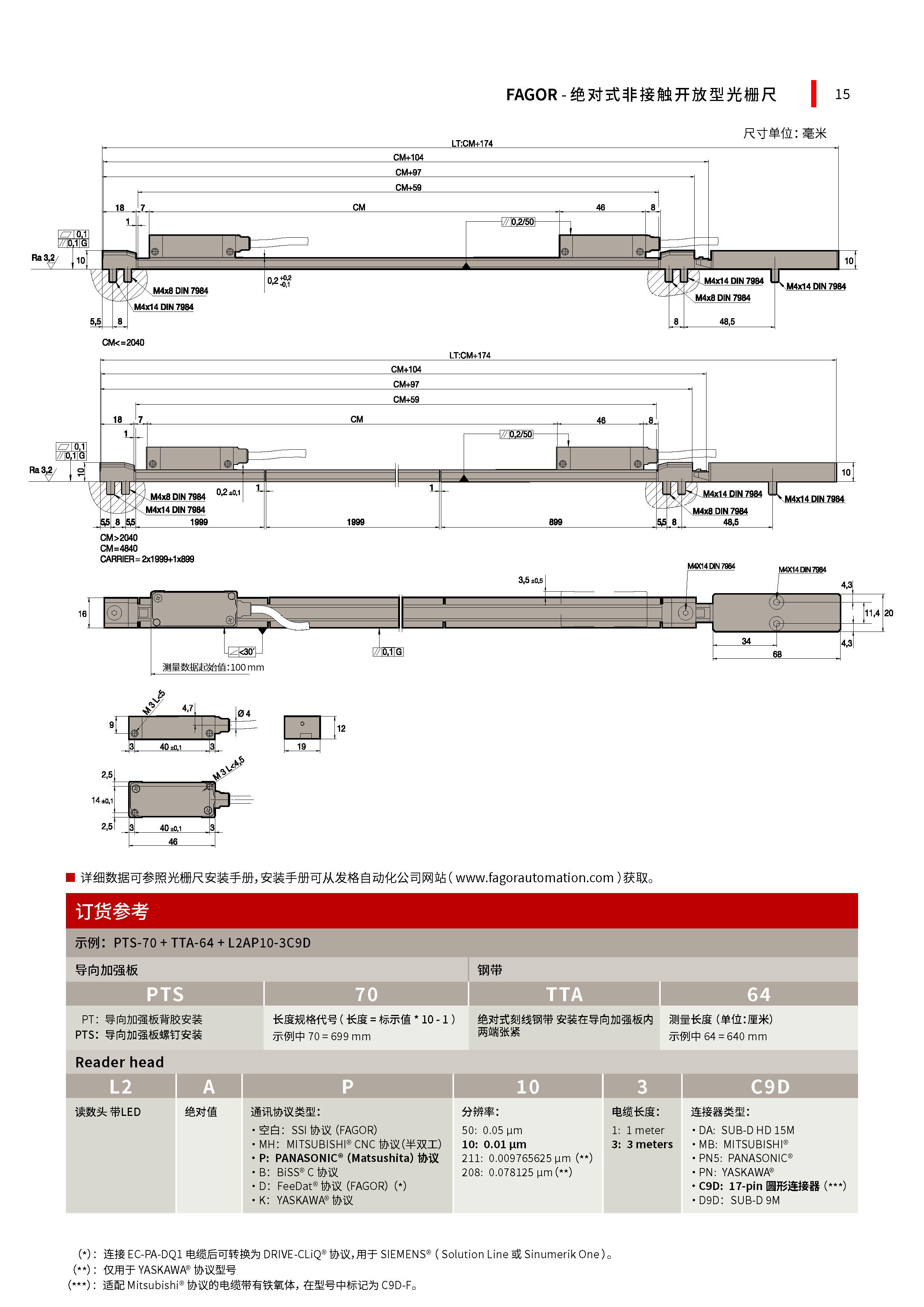 PT + TTA + L2AMH: 绝对钢带刻度尺+支持MITSUBISHI® CNC半双工通信协议的读数头+铝制导向加强板.
